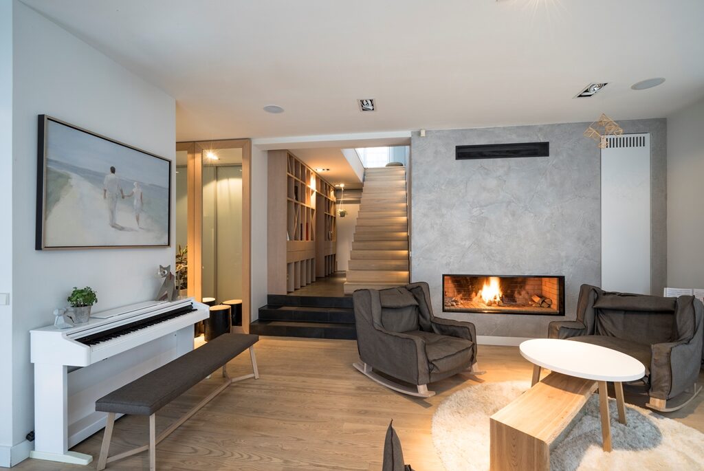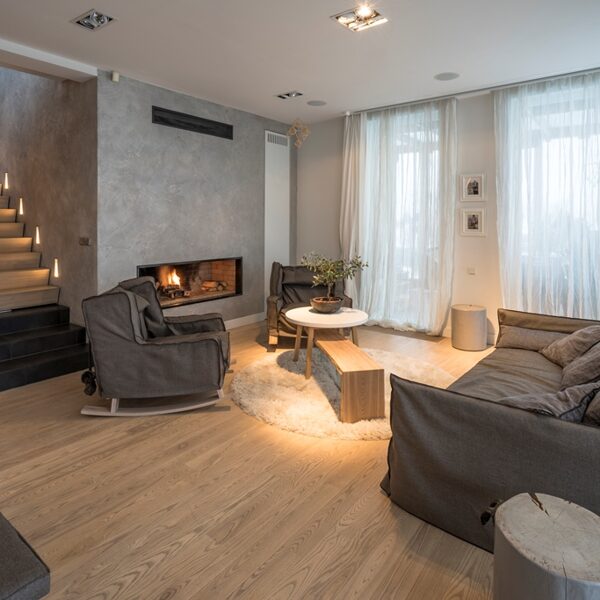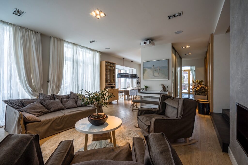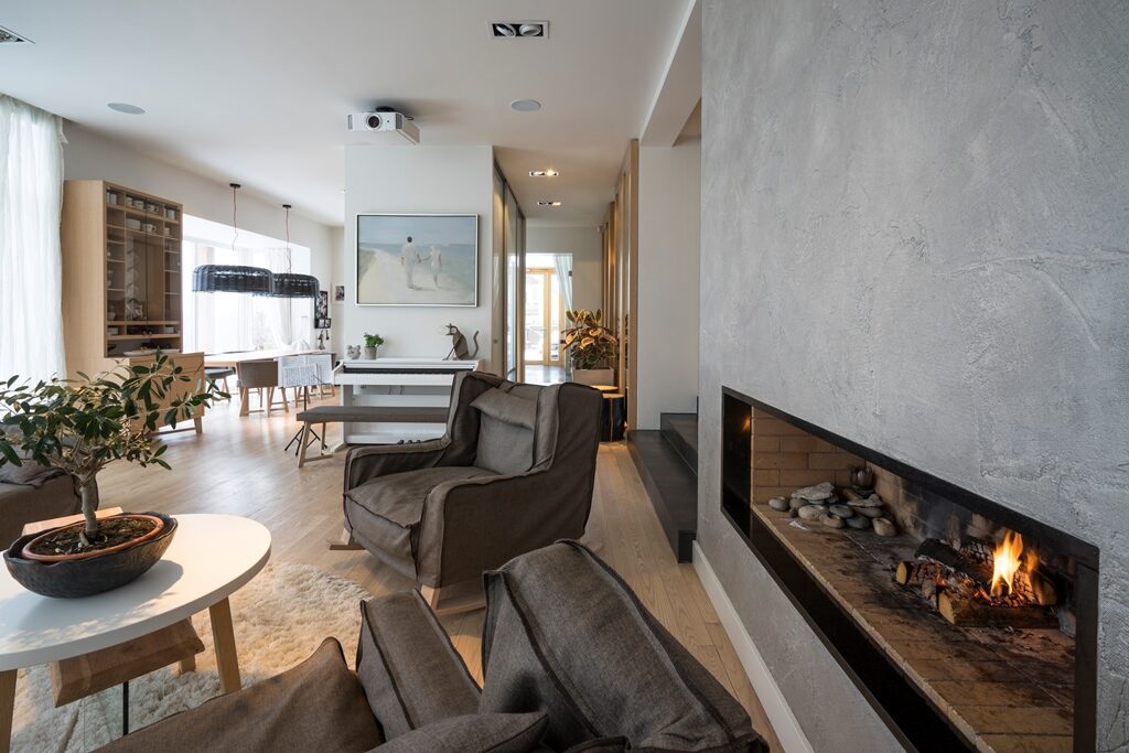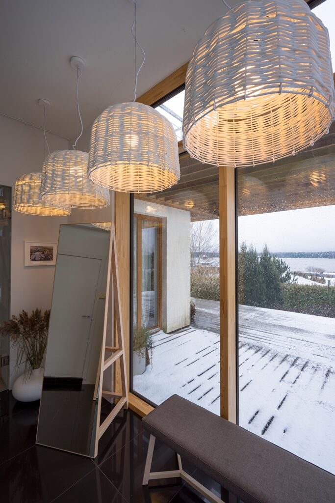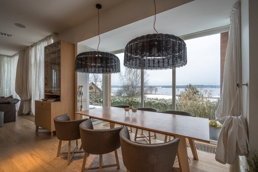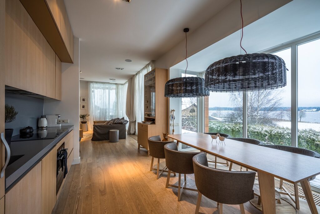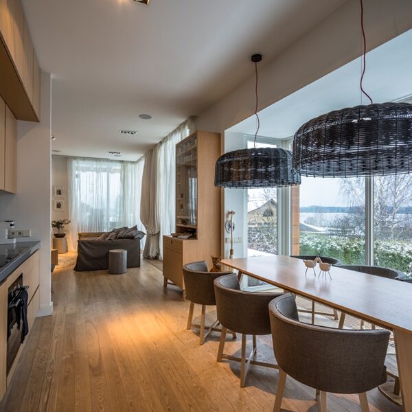Interjera dizaina projekts un realizācija privātmājas pirmajam stāvam ar skatu uz upi.