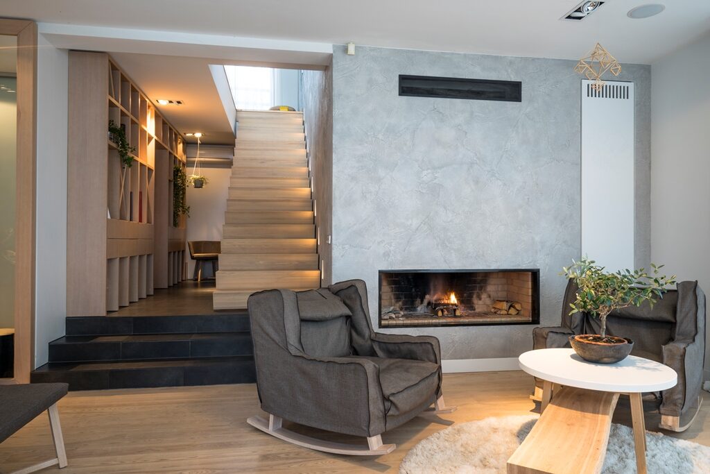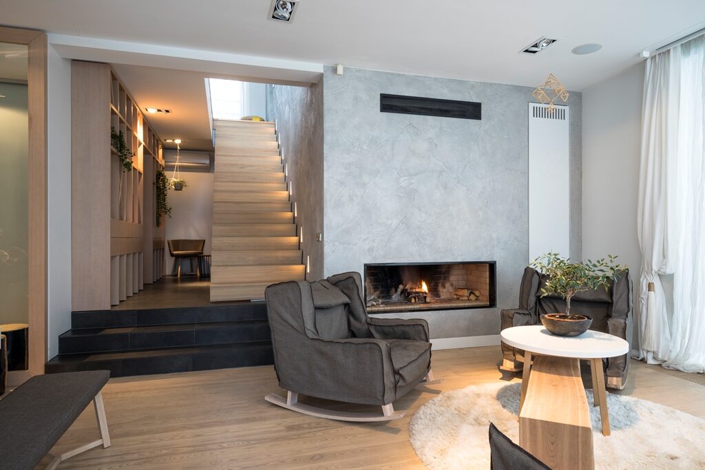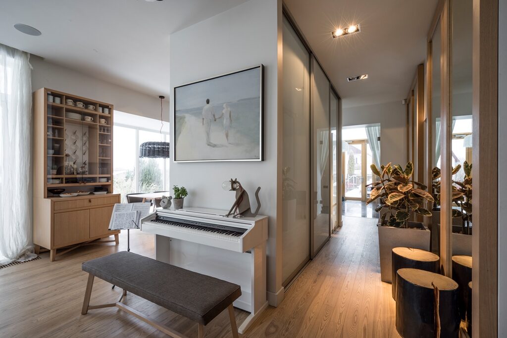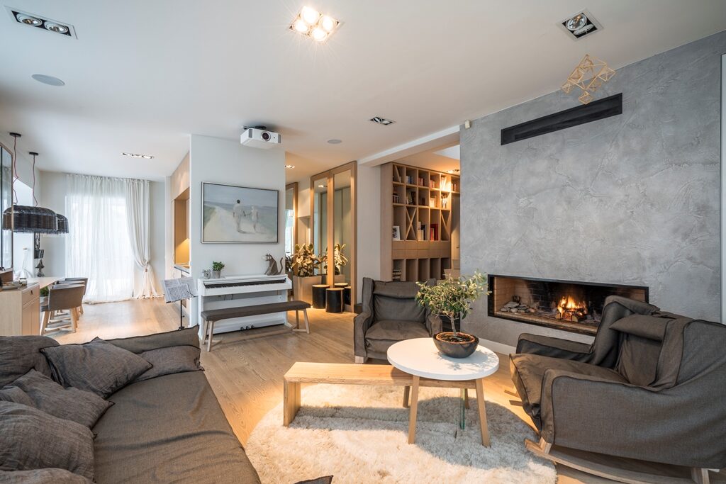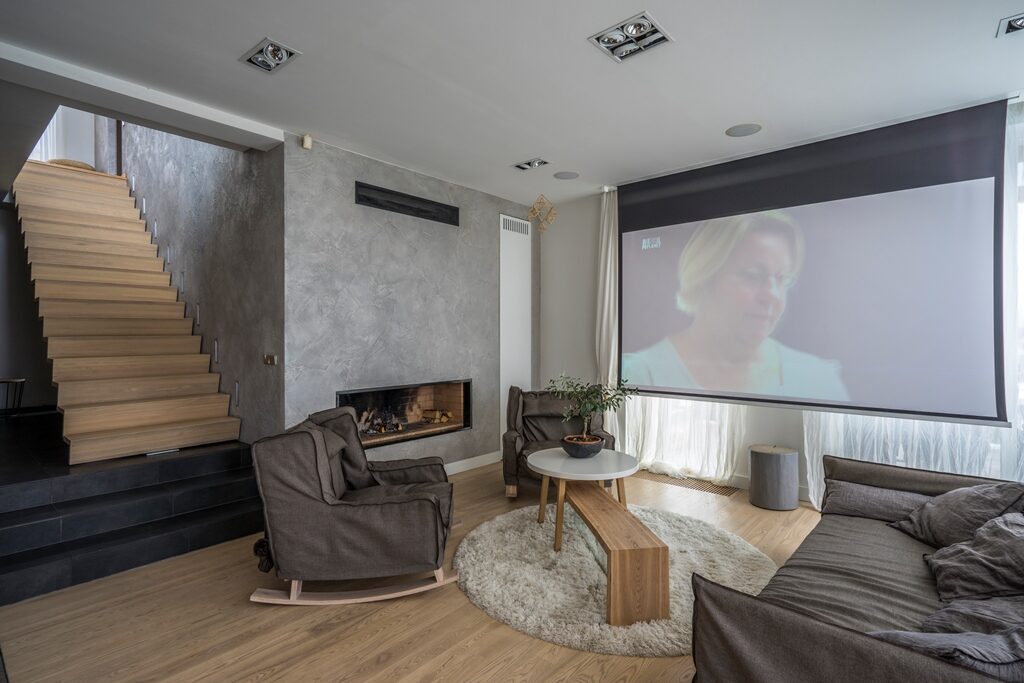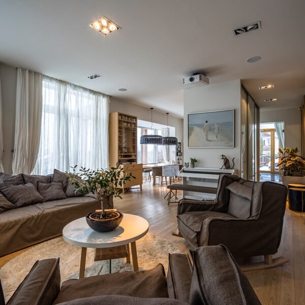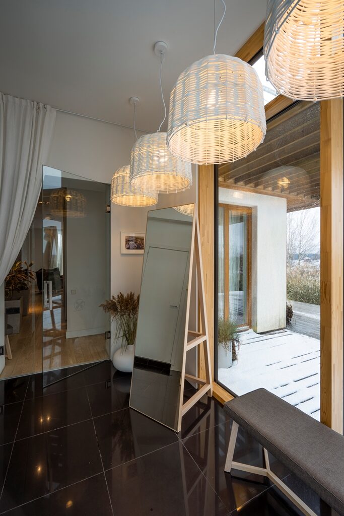Interjera dizaina projekts un realizācija privātmājas pirmajam stāvam ar skatu uz upi.